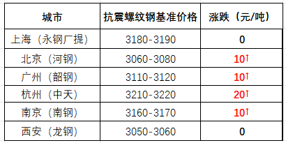 截至午間,國內(nèi)部分市場螺紋鋼(抗震)基價如下:上海市場3180-3190元/噸;北京市場3060-3090元/噸;廣州市場3110-3120元/噸;杭州市場3210-3220元/噸;南京市場3160-3170元/噸;西安市場3050-3060元/噸。環(huán)比來看,截至上午收盤,全國主要市場一線品牌價格穩(wěn)中回升。
