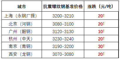 截至午間,國(guó)內(nèi)部分市場(chǎng)螺紋鋼(抗震)基價(jià)如下:上海市場(chǎng)3200-3210元/噸;北京市場(chǎng)3080-3110元/噸;廣州市場(chǎng)3120-3130元/噸;杭州市場(chǎng)3230-3240元/噸;南京市場(chǎng)3190-3200元/噸;西安市場(chǎng)3070-3080元/噸。環(huán)比來(lái)看,截至上午收盤,全國(guó)主要市場(chǎng)一線品牌價(jià)格穩(wěn)中回升。