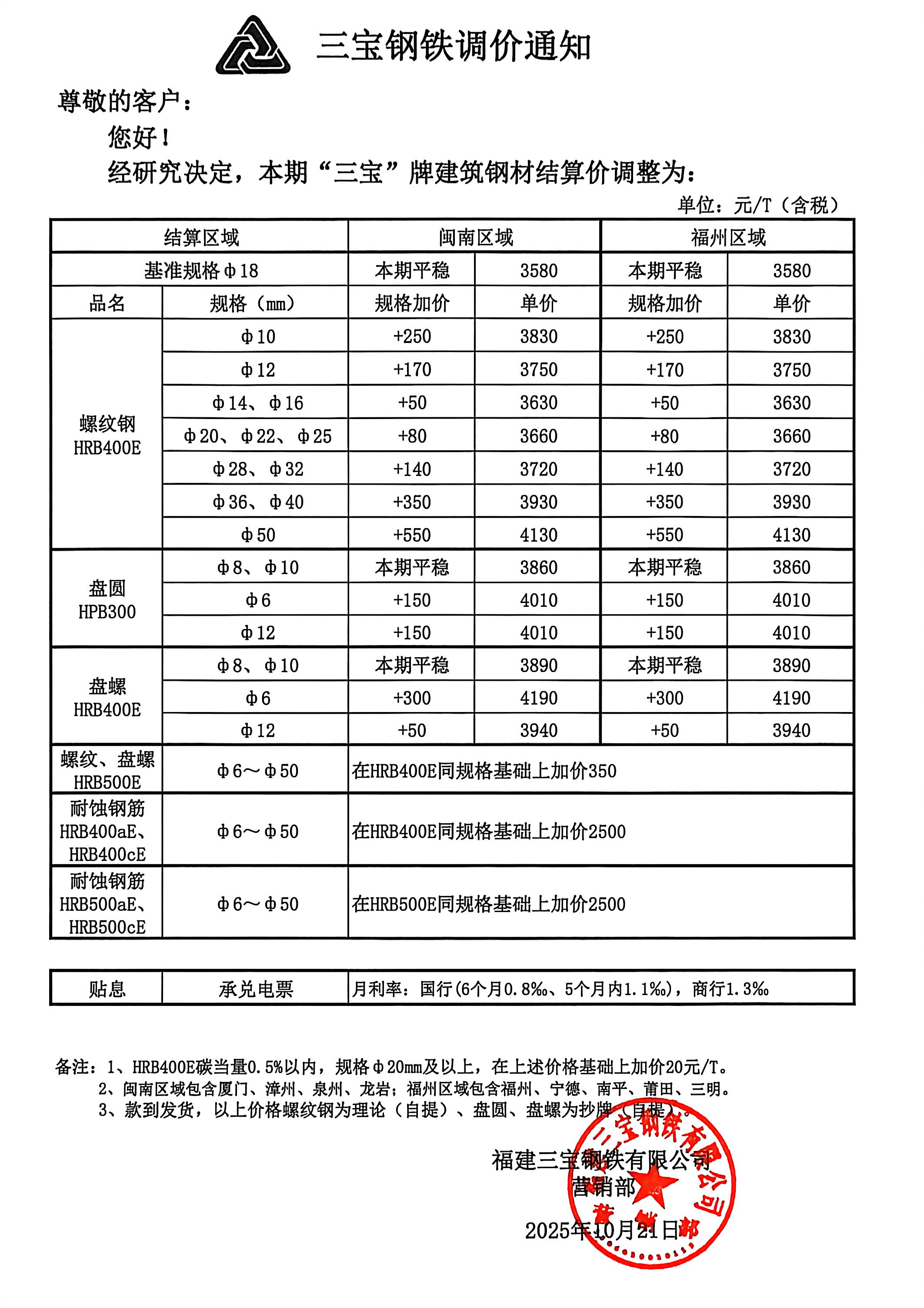 西本訊:10月21日,福建三寶建筑鋼材出廠價(jià)格調(diào)整如下: