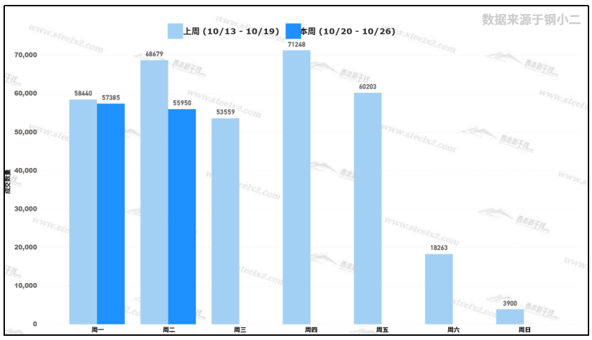 據(jù)鋼小二平臺樣本數(shù)據(jù),10月21日采樣全國工程需求量為55950噸,環(huán)比上個交易日微降2.5%。