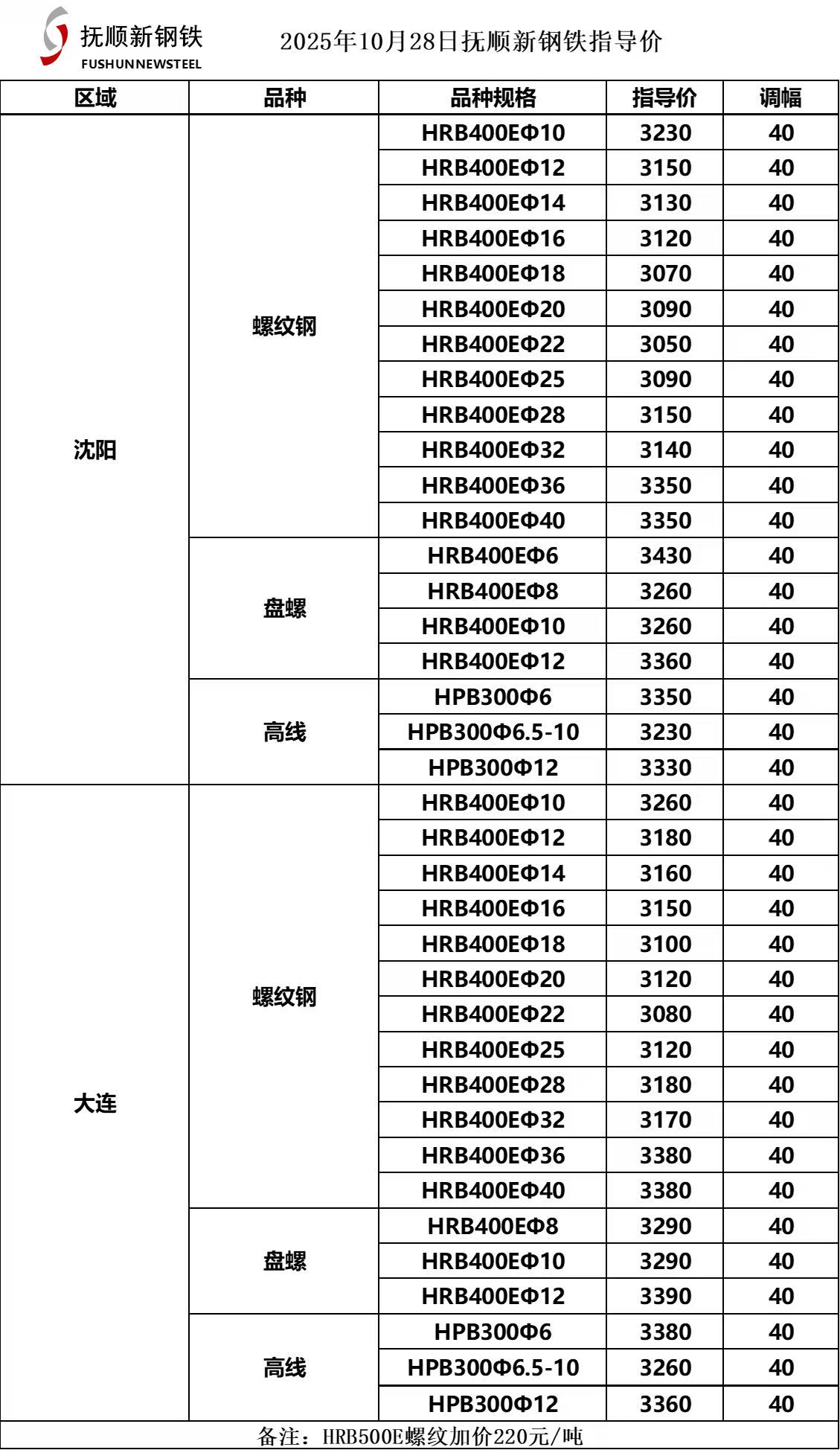 10月28日撫順新鋼鐵調(diào)價(jià)信息