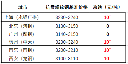 截至午間,國(guó)內(nèi)部分市場(chǎng)螺紋鋼(抗震)基價(jià)如下:上海市場(chǎng)3230-3240元/噸;北京市場(chǎng)3130-3150元/噸;廣州市場(chǎng)3140-3150元/噸;杭州市場(chǎng)3230-3240元/噸;南京市場(chǎng)3200-3210元/噸;西安市場(chǎng)3100-3110元/噸。環(huán)比來(lái)看,截至上午收盤,全國(guó)主要市場(chǎng)一線品牌價(jià)格多有調(diào)高。