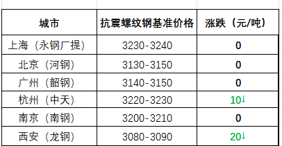 截至午間,國內(nèi)部分市場螺紋鋼(抗震)基價如下:上海市場3230-3240元/噸;北京市場3130-3150元/噸;廣州市場3140-3150元/噸;杭州市場3220-3230元/噸;南京市場3200-3210元/噸;西安市場3080-3090元/噸。環(huán)比來看,截至上午收盤,全國主要市場一線品牌價格多數(shù)持穩(wěn),少數(shù)調(diào)低。