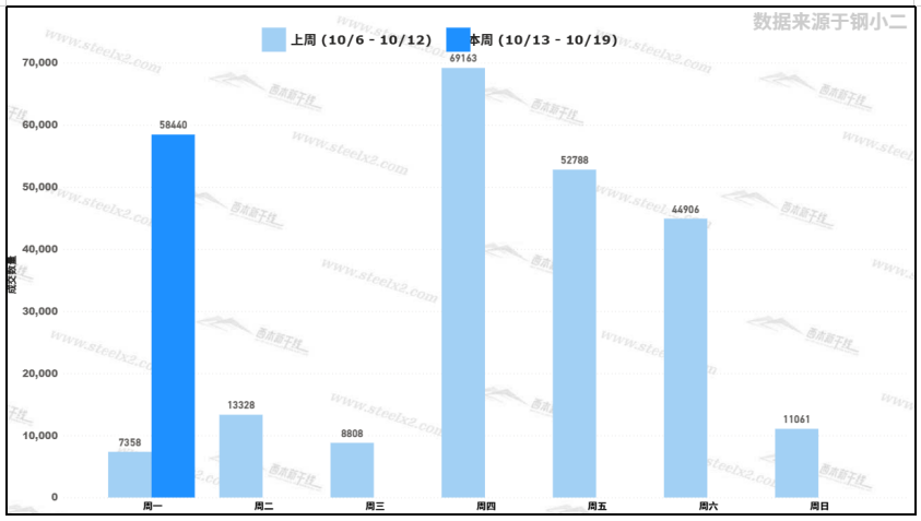 據(jù)鋼小二平臺樣本數(shù)據(jù),10月13日采樣全國工程需求量為58440噸,環(huán)比上個交易日上漲30%,較上周一成交量大幅增加。