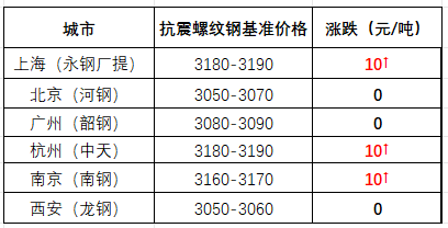 截至午間,國內(nèi)部分市場螺紋鋼(抗震)基價如下:上海市場3180-3190元/噸;北京市場3050-3080元/噸;廣州市場3080-3090元/噸;杭州市場3190-3190元/噸;南京市場3160-3170元/噸;西安市場3050-3060元/噸。環(huán)比來看,截至上午收盤,全國主要市場一線品牌價格穩(wěn)中小漲。