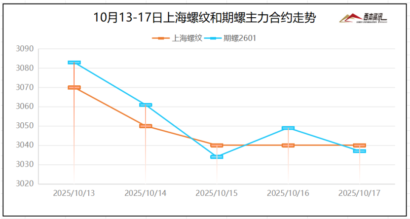 (2)周初至周三,受美國威脅大幅加征關稅,負面情緒蔓延,期螺空頭增倉打壓,盤面刷新3個月新低,逼近3000點關口。周四多頭增倉施壓,盤面一度試探見長,然周五空頭再度集結力量,盤面偏弱小幅回落。截至10月17日,螺紋2601主力合約報在3037,周環(huán)比下降66。